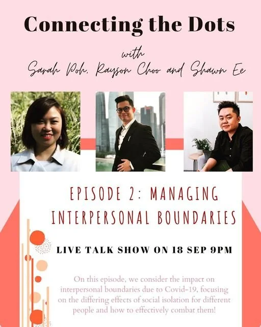 Live broadcasting the second episode: Managing Interpersonal Boundaries of our podcast series CONNECTING THE DOTS! With host Sarah, co-host Rayson and our guest speaker Shawn, we will be examining the impacts on interpersonal boundaries brought about by Covid-19. More specifically, we will be delving into how social distancing affects people differently, analysing the relation between cabin fever and the experience of being a latchkey child and also providing tips on how to ease anxiety and paranoia.